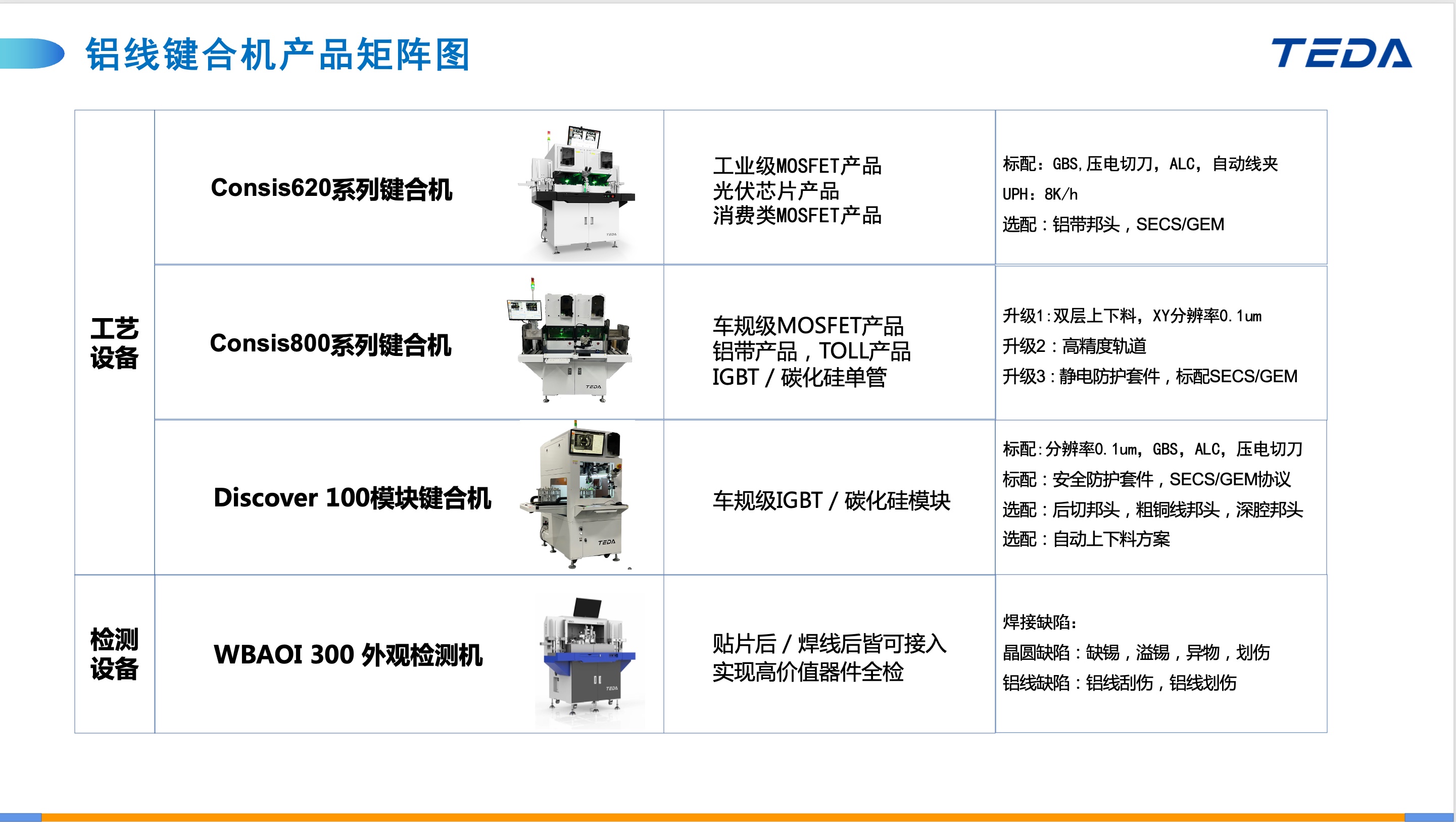 深圳市泰達智能裝備有限公司 泰達智能是深圳泰沃德技術全資子公司,專注于功率半導體封裝測試的鋁線鍵合工藝,團隊包括哈爾濱工業大學,華中科技大學等知名院校及半導體智能裝備行業的資深經營管理人才。 公司秉承“進口替代”的經營理念,產品對口平替美國半導體封測設備。同時,根據客戶的工藝要求,定制開發一些軟硬件解決方案。快速匹配客戶新產品的開發需求。 泰達智能設備依托于具有自主知識產品的超聲焊接工藝管理系統,高速高精的多軸運動控制系統,微米級精密設計與工藝系統經驗,為半導體客戶提供精度高,穩定性強,一致性好的高性價產品。